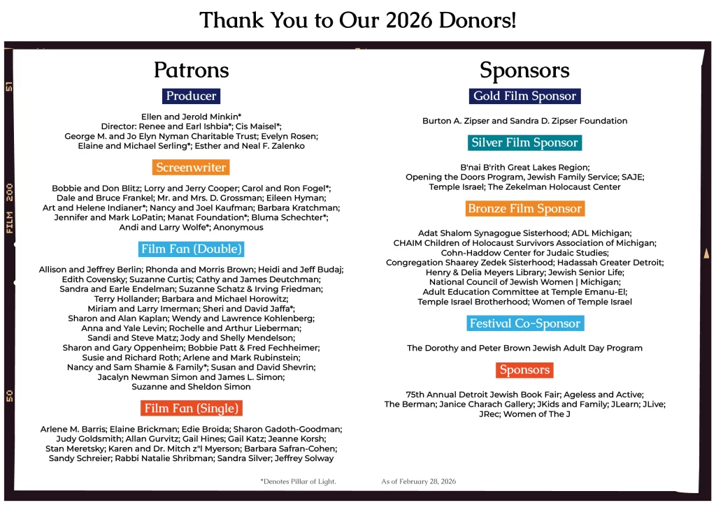 The Lenore Marwil Detroit Jewish Film Festival celebrates the art of Jewish filmmaking by presenting films, encouraging discussion about Jewish stories, and creating shared experiences with filmmakers and audiences around the world. And through our history of promoting Israeli cinema as part of our diverse selection of Jewish films, we’re continuing to build a sense of community and inclusion for a broad range of audience members.